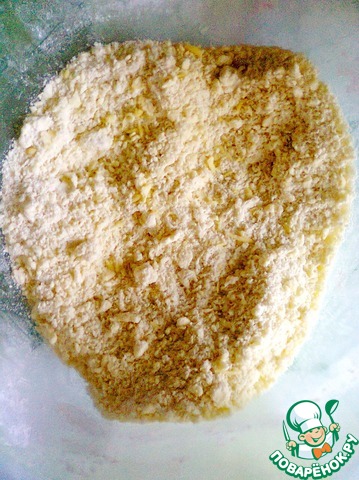 Масло порубить с мукой, добавить соду, яйцо и воду.