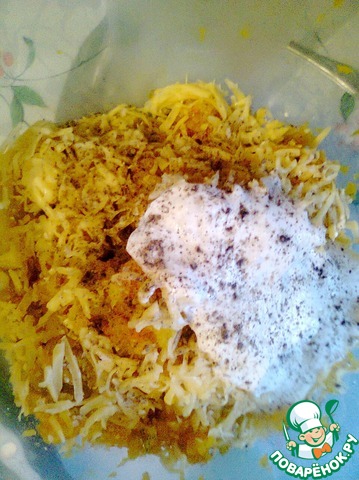 Тем временем приготовить начинку. Тыкву почистить, порезать и запечь до мягкого состояния. Затем чеснок и тыкву протереть на мелкой терке, добавить соль, перец, йогурт и половину тертого сыра. Все хорошо перемешать.