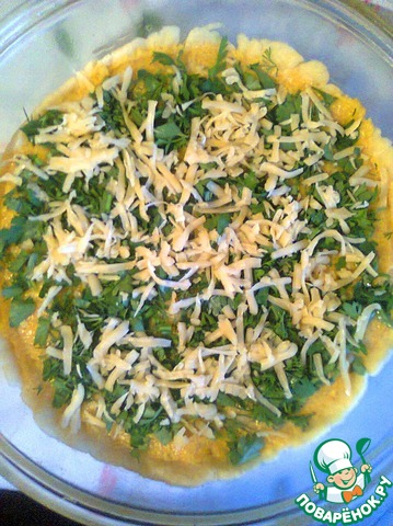 Тесто вынуть из холода, проколоть в нескольких местах вилкой. Выложить на тесто начинку, после рубленую зелень и присыпать все тертым сыром.