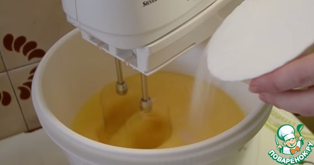 Постепенно в яйца добавляем сахар и ванильный сахар, одновременно взбивая. Взбивать до полного растворения сахара. Яйца должны увеличиться в объеме в несколько раз