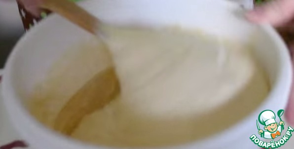 Аккуратно, по чуть-чуть добавляем в яйца просеянную муку и перемешиваем деревянной или силиконовой лопаткой, добавляем разрыхлитель гашеный лимонным соком (если нет разрыхлителя можно добавить соду гашеную уксусом)