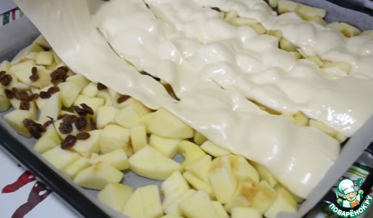 На противень выкладываем яблоки, сверху посыпаем изюмом и выливаем тесто. Выпекать в духовке при температуре 180-190 гр. 30 минут