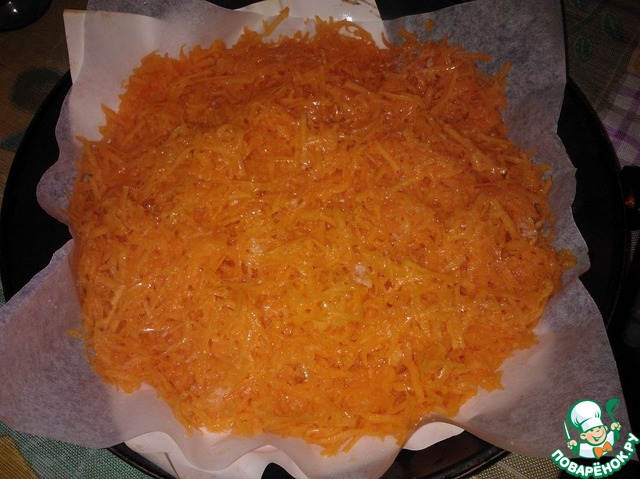 Трем тыкву на большой терке и укладываем на пергамент в форму. Растопить сливочное масло и полить тыкву, так же сверху поливаем соком половины апельсина. И я обычно еще добавляю немного измельченных грецких орехов, но это на любителя.