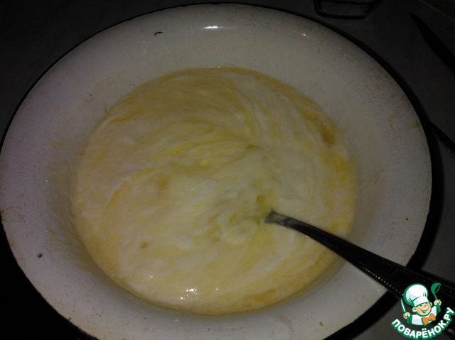 Теперь делаем заливку. В миске взбиваем до однородной массы яйца, соль, Сода гашенная уксусом, сметану, майонез, муку, сахар и ваниль.