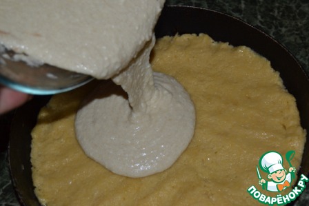 4. Достаём тесто из морозилки, раскатываем его на смазанную маслом форму. Выливаем нашу начинку.