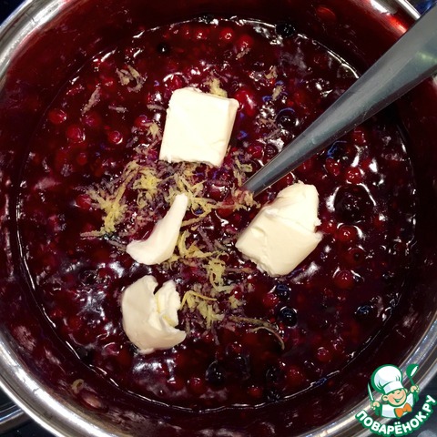 Добавляем ягоды и хорошо прогреваем еще пару минут. У меня была черная и красная смородина, и буквально 100 грамм малины, вишни и клубники. Выключаем и оставляем на 10 минут.