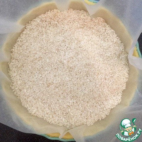 Теперь застилаем пергаментом, засыпаем "груз" и в духовку на 15 минут при 190 градусах. Тут я, конечно, немного накосячила: положила очень тонкий и легкий слой риса, из-за этого при выпечке он практически не сыграл роли и бортики достаточно сильно опустились. Расстроилась, но что уж тут. Не повторите моей ошибки.