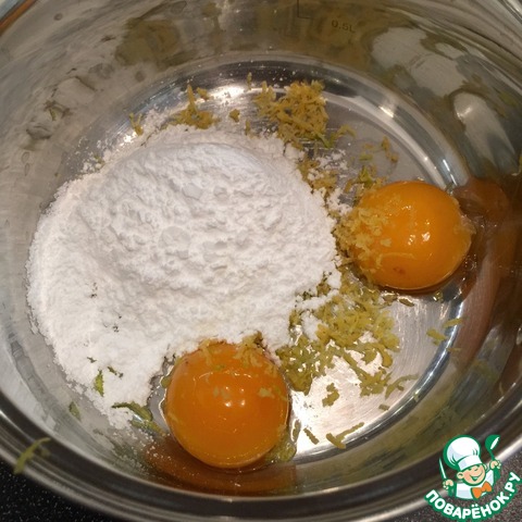 Теперь эту массу постепенно добавляем к муке, туда же лимонный сок и воду.