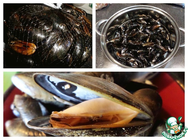 1. Первым делом выкладываем размораживаться тесто, если у вас оно из морозильника. И обратим своем внимание на мидии: почистим, помоем, уберем «бороды», выкинем все открытые.