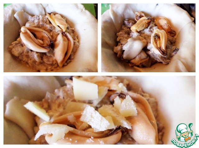 5. Собираем наш пирог: первым идет грибной соус, на него укладываются мидии, сверху крошим сыр. Если вам кажется, что конструкция суховата – подлейте еще немного сливок.