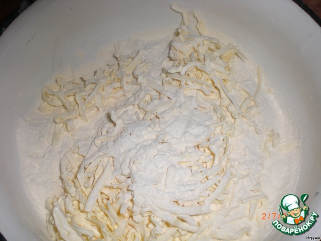 Муку просеем в миску, сверху натрём на тёрке холодный маргарин.
