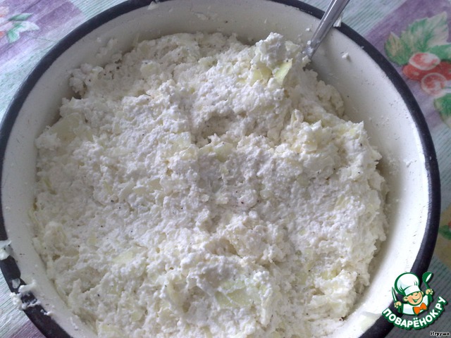 Измельчённый лук соединяем с подготовленным творогом и хорошо перемешиваем. Это наша начинка.
