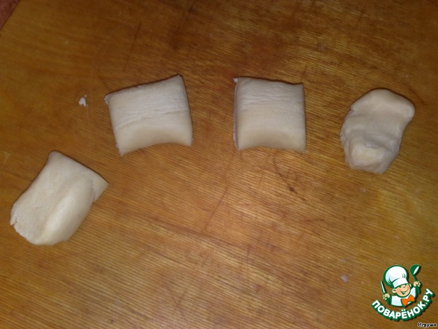 Вынимаем тесто из холодильника, отрезаем кусок и скатываем в колбаску. Колбаску делим на несколько частей.
