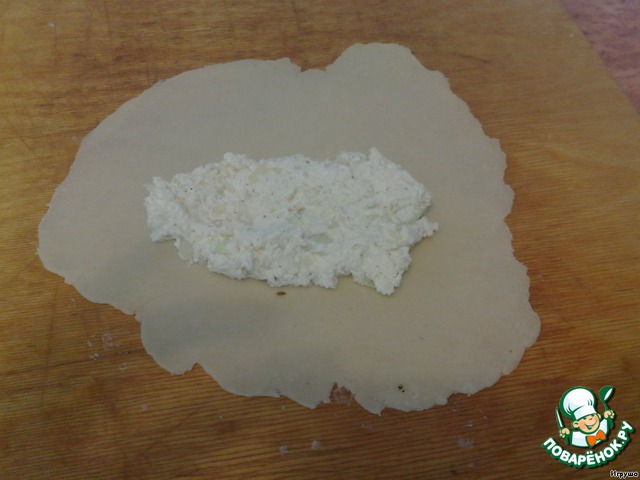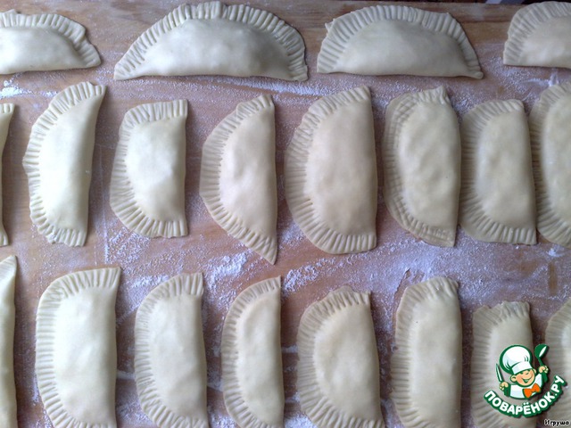 На нижнюю часть получившегося овала кладём полную ст. ложку начинки(начинки не жалеем),накрываем верхней частью, хорошо защипываем края.