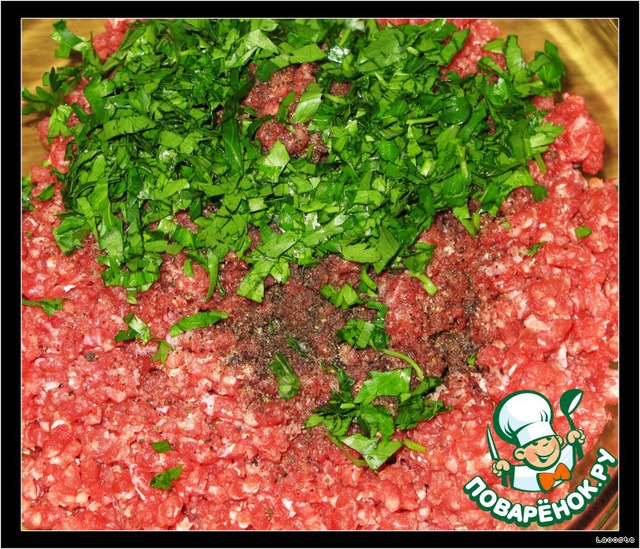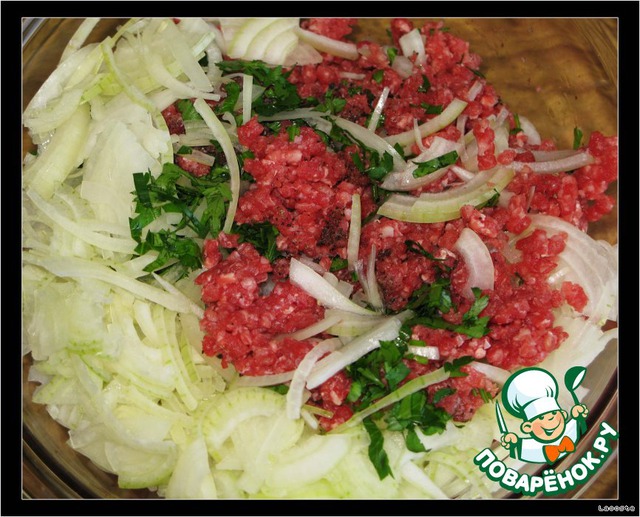 Готовим мясную начинку: фарш посолить, поперчить, добавить мелко нарезанную зелень, репчатый лук, нарезанный тонкими четвертинками колец, влить кефир (для сочности мяса), тщательно перемешать и дать пропитаться луковым соком.
