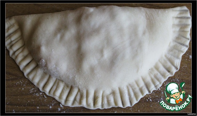 Тесто делим на 24-26 кусочков, формируем шарики, раскатываем шарик до толщины 1-2 мм в круглую лепешку (диаметр определяется размером посуды, в которой будем жарить), на одну часть кладем фарш (отступив от края лепешки 1см), накрываем второй частью, тщательно защипываем края и прижимаем их вилкой.