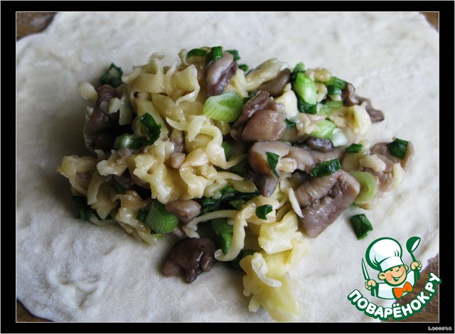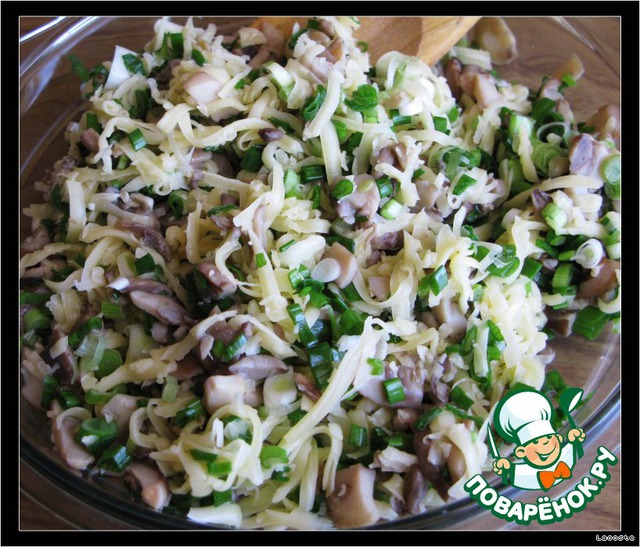 Готовим грибную начинку: размороженные грибы обжарить на сухой сковороде, остудить, добавить тертый сыр, мелко нарезанный зеленый лук, посолить и перемешать.
