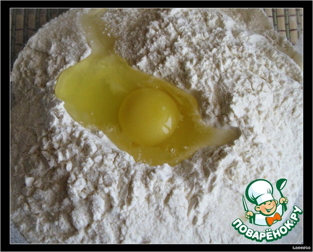 Тесто: просеянную муку перемешать с солью, сахаром, вбить яйцо, влить воду и вымешивать в течение 10 минут. Накрыть полотенцем и дать отдохнуть около 20 минут.