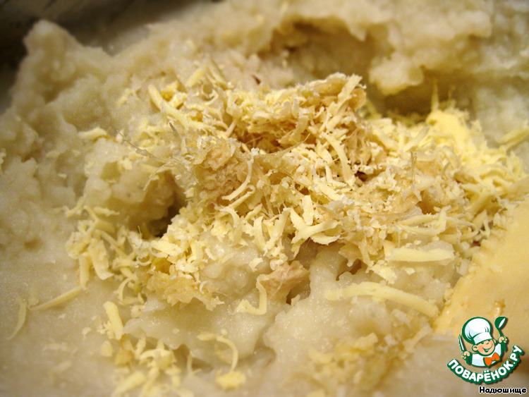 И займемся картошкой. Отвариваем, превращаем в пюре, остужаем. Добавляем соль, специи, тертый имбирь и немного тертого сыра.