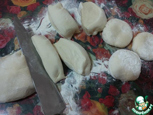 Готовое тесто припылить мукой, разделить его на кусочки ( у меня они получились около 70 г), сделать колобки. Я разделила на 10 частей.