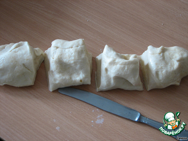 Тесто скатать в толстую колбаску и разделить ее на 4 части.
