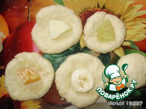 Отделить часть теста, раскатать трубочкой и нарезать на несколько небольших частей. Скатать в шарики, размять руками в кружок, делая небольшое углубление в центре. Кладем кусочек фрукта и защипываем края.