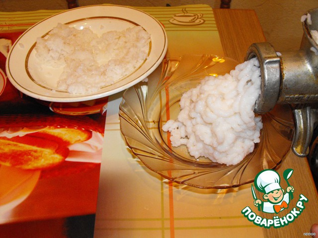 Рис отварить до готовности, промыть и пропустить через мясорубку.
