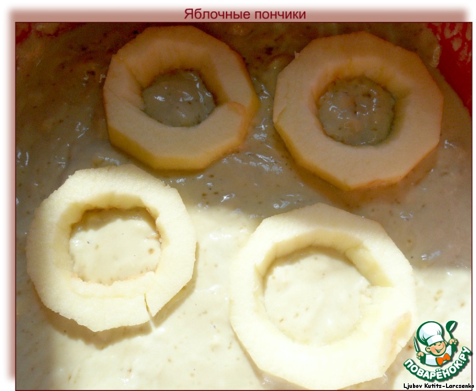 Обмакнуть каждую пластинку яблока в тесто и обжарить около 1 минуты с каждой стороны.