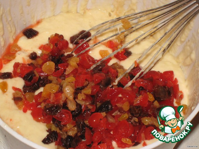 Затем добавляем замоченные в роме сухофрукты, если жидкость осталась, то ее вылить тоже, хотя сухофрукты должны впитать весь ром или другое спиртное.