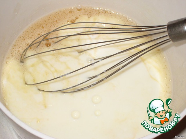 Яйца взболтать с сахаром, не взбивать, а чтобы только размешалось до однородности.