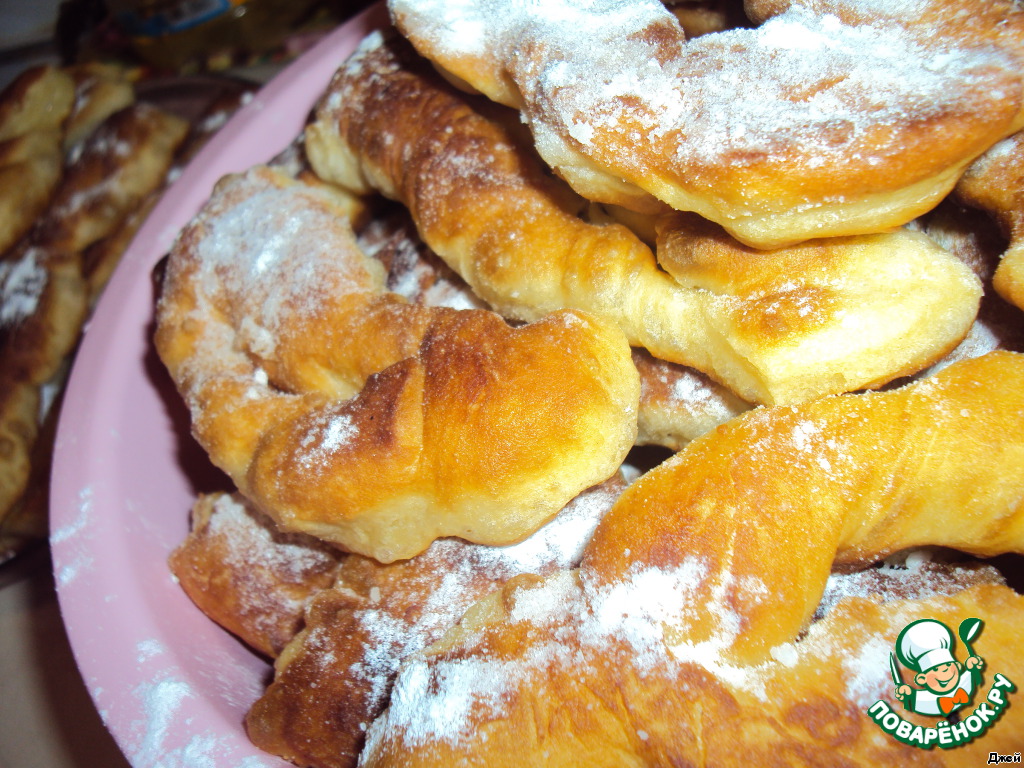 Ну, а затем раскатываем тесто и делаем произвольные фигурки (я делала, как хворост) и обжариваем в большом количестве масла.