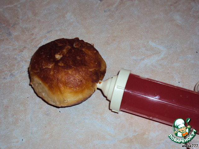 Готовые пончики остудить на решётке или бумажной салфетке. Каждый пончик начинить клубничной начинкой из шприца с тонкой насадкой для эклеров.