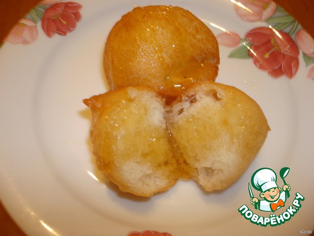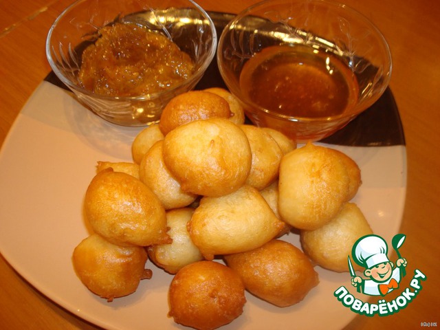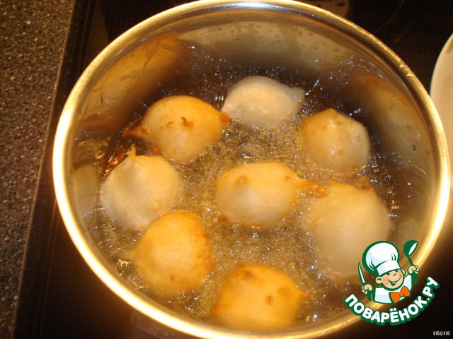 Hаливаем масло (много, чтобы пончики могли там плавать) в кастрюлю и ставим на плиту, берем ложкой тесто и опускаем в раскаленное масло, при этом ложку каждый раз окунаем в стакан с водои.