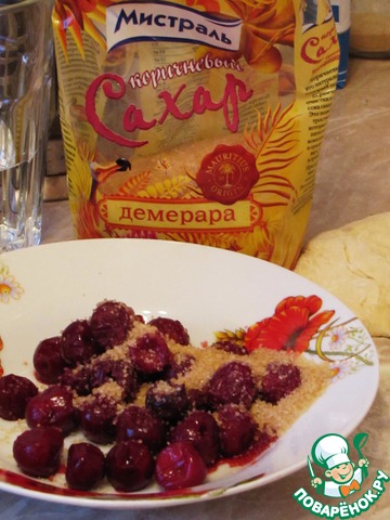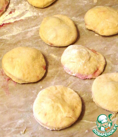 Тесто делим на две части, раскатываем. Стаканом вырезаем кружочки и укладываем вишню (сок сливаем).