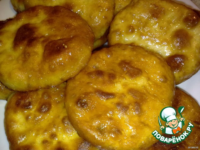 В глубокой сковороде разогреть растительное масло и выкладывать лепешки для обжарки (можно запечь в духовке при 180*, только противень выложить пергаментом и посыпать мукой)