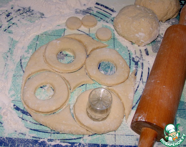 Раскать тесто. Стаканом вырезать нЕ тонкие кружочки. (У меня пивной стакан в диаметре 9 см.) Серединку кружочков вырезать маленькой рюмочкой. (Моя рюмочка - 4 см).