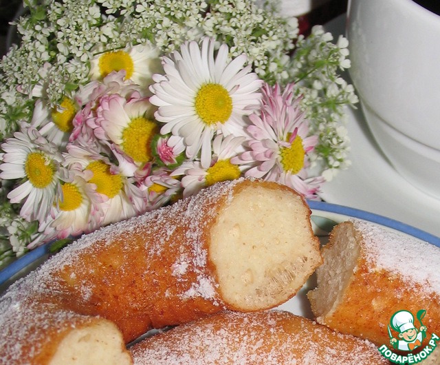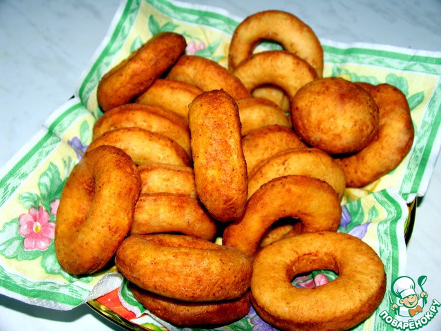 | На кухне разговаривали с мл. сыном о моём детстве. Я ему рассказывала о том, что вкусненького готовила моя мама, его бабушка. Вспомнила, что мама жарила круглые пончики на свином сале. Сильно хотелось мне тогда пончиков, но я не выносила на дух запах и вкус свиного сала... Сын сморщился и попросил сделать вкусных пончиков - колечек, каких им в школе давали... Рецепта школьных пончиков я не знаю, но форма получилась такая же. |