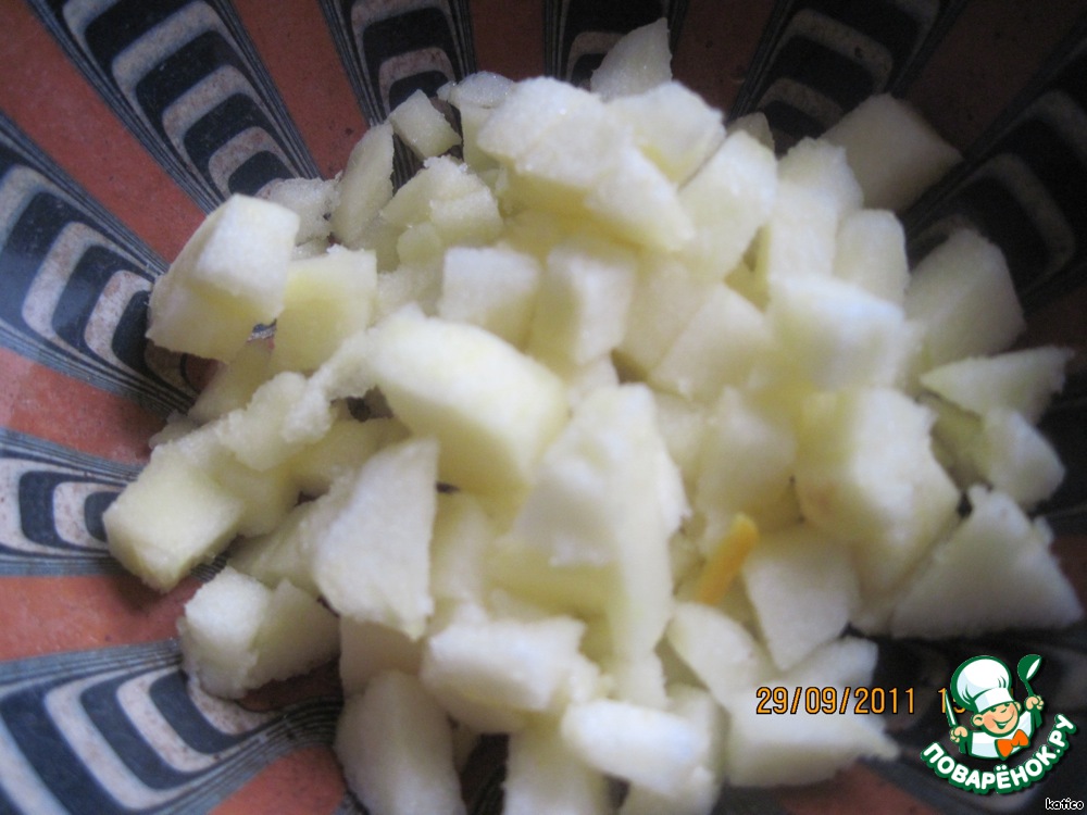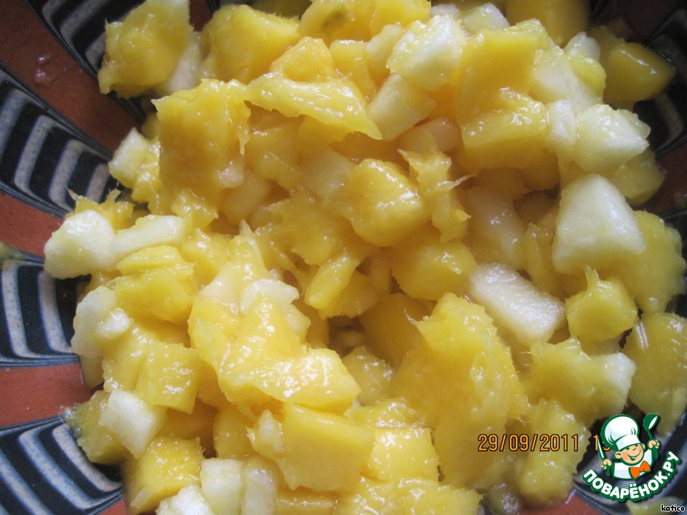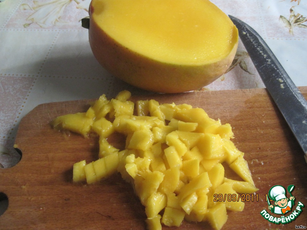 Если у Вас не будет под рукой манго, можно положить изюм, грушу или дыню, можно, вообще, делать только с яблоками или любой другой начинкой на Ваш вкус. Кстати, зеленый манго, есть такой сорт, не подойдет. У меня "пылился" в холодильнике манго, я отрезала от него бочок, очистила от кожуры, нарезала кубиками.