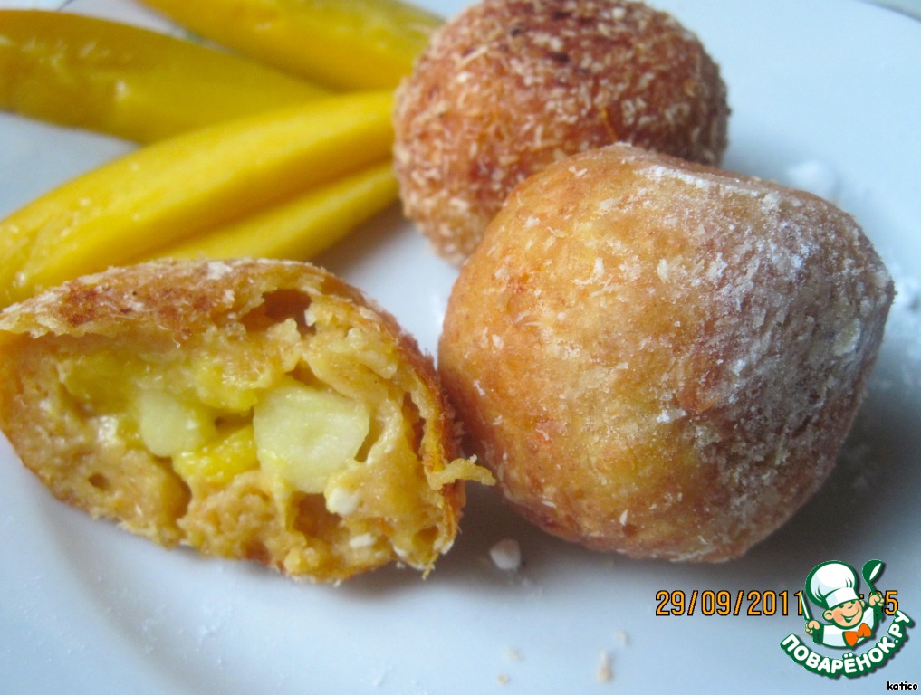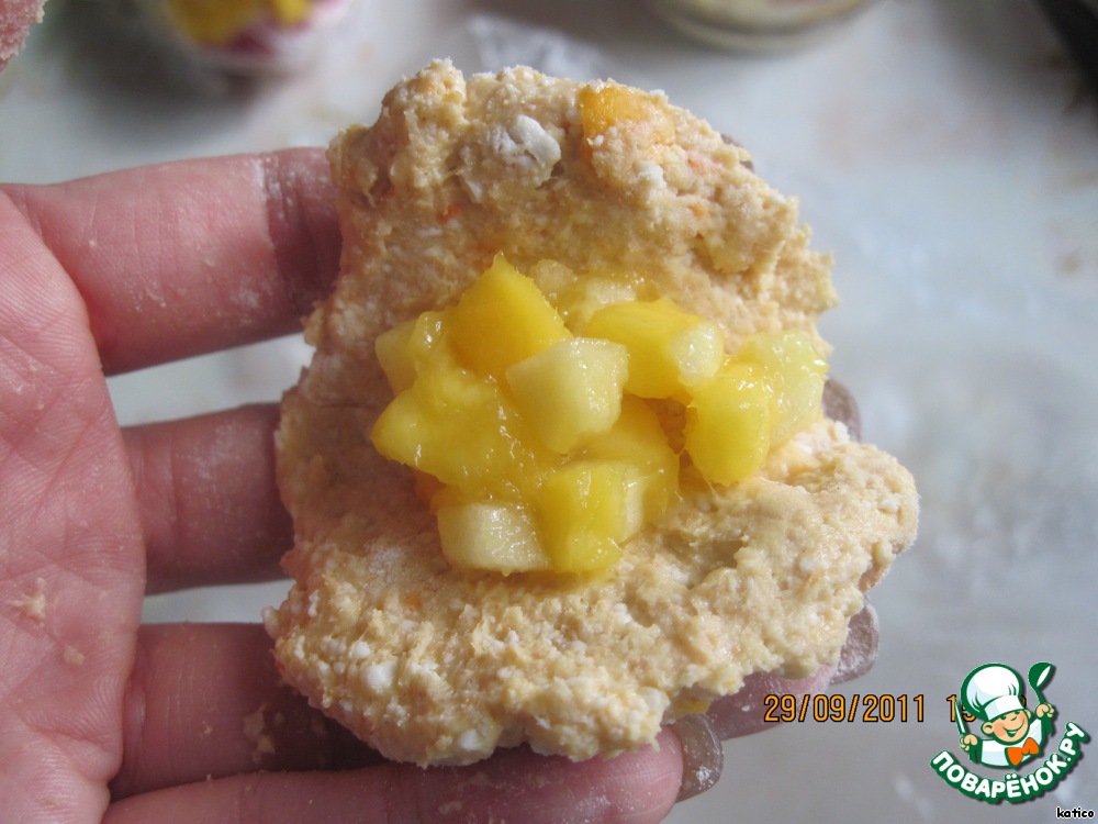 Обмакните руки в муку или масло, возьмите около чайной ложки творожно-тыквенной массы, сформируйте тонкую лепешку, чем тоньше, тем лучше! Добавляйте муки, если тесто сильно липнет к рукам. Положите в центр немного яблочно-манговой начинки, защипните края, придайте форму шара.