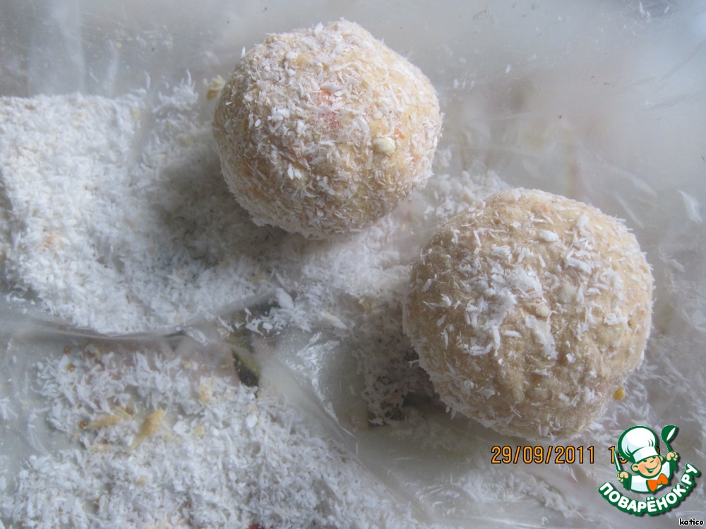 ХОРОШЕНЬКО обваляйте шарики в кокосовой стружке.
