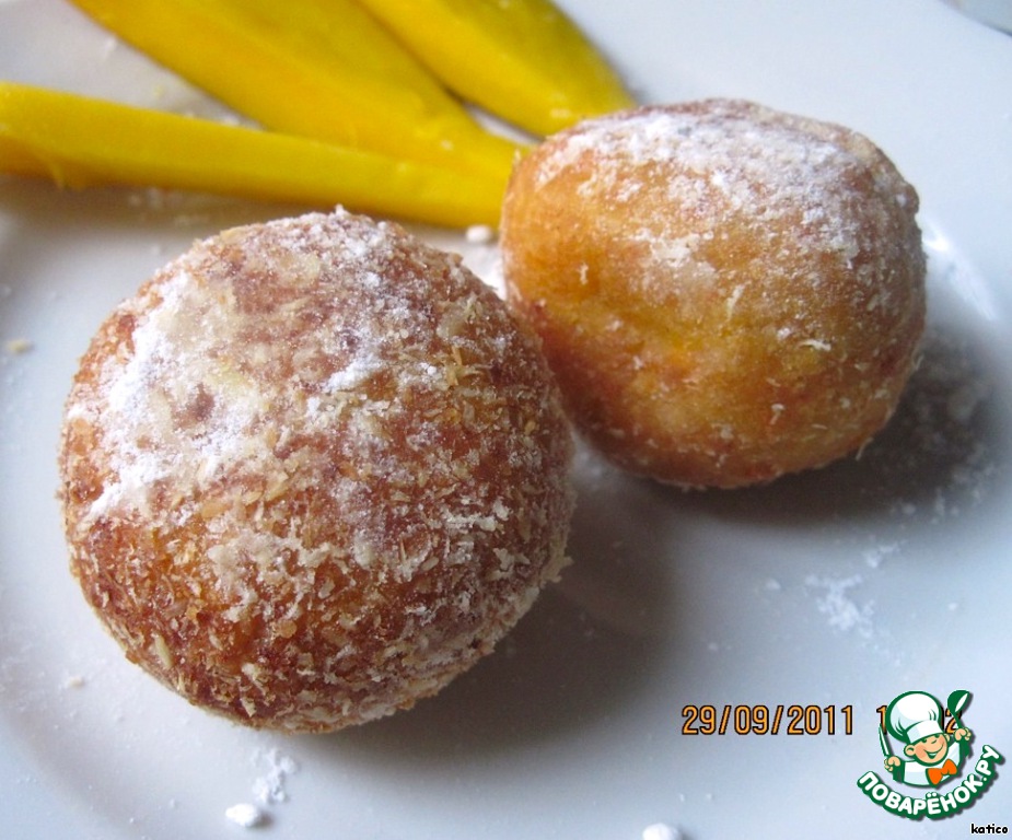 | Не знаю как у вас, а у нас сегодня целый день идет дождь, настроение как-то сникло, захотелось чего-нибудь необычного... В результате получились ОЧЕНЬ ВКУСНЫЕ пончики - хрустящие, сочные, с ароматом апельсина, кокоса и манго. |