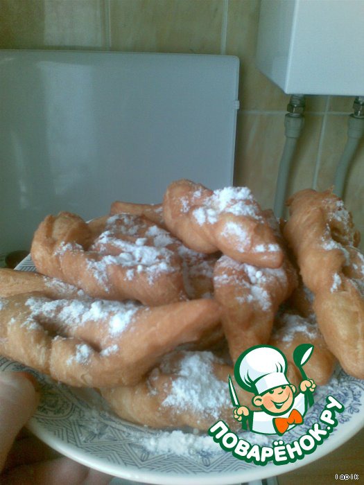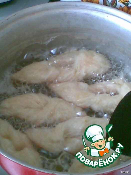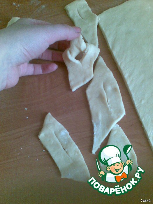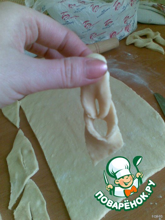 Тесто раскатываем, разрезаем на полосы, каждую полосу режем на ромбики по 7-8 см. В серединке каждого ромбика делаем надрез. В этот надрез продеваем один из краев ромбика