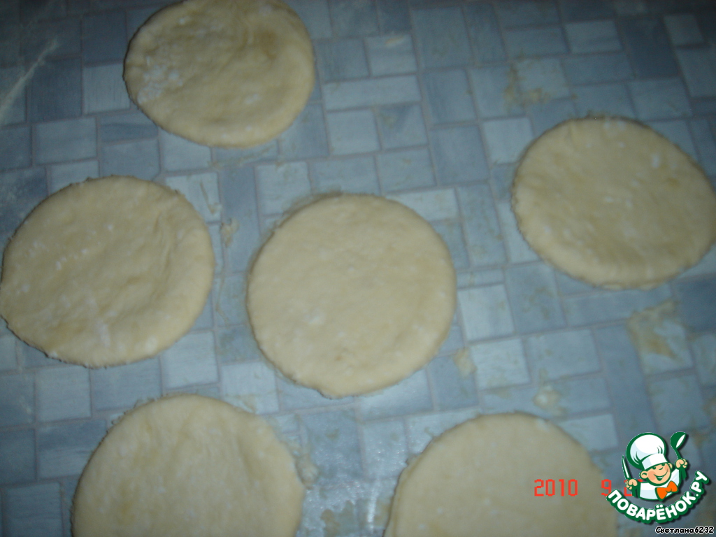 2. Раскатать тесто толщиной 0,5 см и стаканом вырезать кружочки.