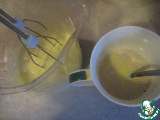 Молоко со сливочным маслом немного нагреть на плите, чтобы масло растаяло. Добавить в него сухие дрожжи, размешать. Взбить яйцо с 50 г сахара, щепоткой соли.