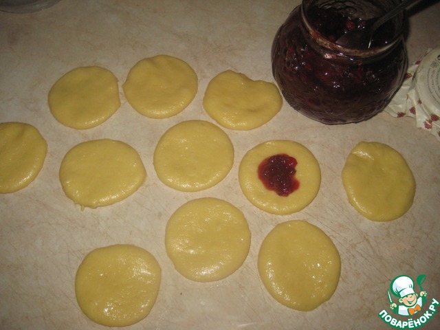 Тесто раскатать и небольшой выемкой вырезать из него кружки. Можно тесто не раскатывать, а скатать из теста жгут, порезать на порционные дольки и каждую дольку раскатать в кружок.