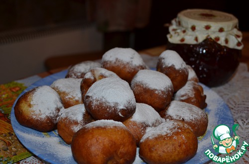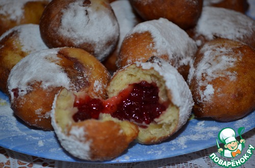 | Что может быть вкуснее горячих пышных пончиков на десерт? Покрыты белой воздушной сахарной пудрой, а при надкусывании из бока пончика вытекает вкусный брусничный соус -такой кисло-сладкий и ароматный... Рецепт взят у Ю. Высоцкой. Попробуйте, пожалуйста! |