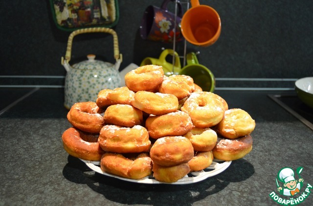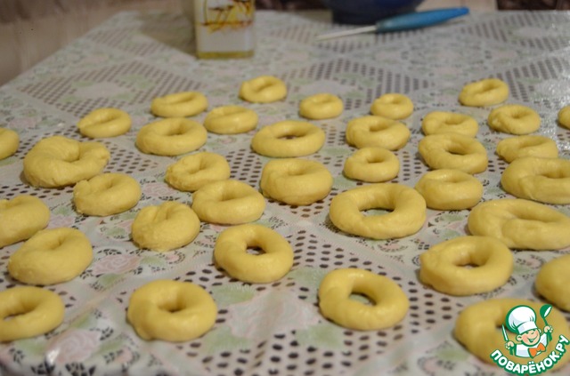 Сформировать из теста пончики любой формы: круглые или с дырочкой посередине. Чтобы тесто не липло к рукам, смажьте их растительным маслом.