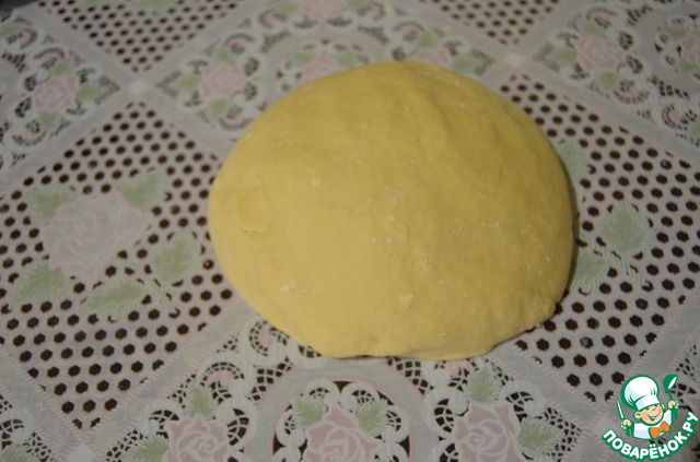 Добавить муку, смешанную с разрыхлителем. Замесить эластичное тесто.