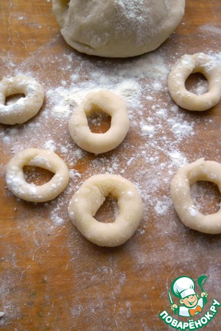 Отрывая небольшие кусочки теста, скатать их в жгутики примерно с мизинец толщиной. Затем скрепить концы жгутика, формируя пончик.