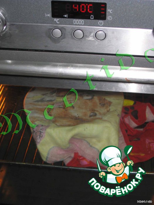 Хорошо вымесить тесто руками, положить в смазанную растительным маслом миску, укутать полотенцем и поставить в разогретую до 40С духовку на 1 час.